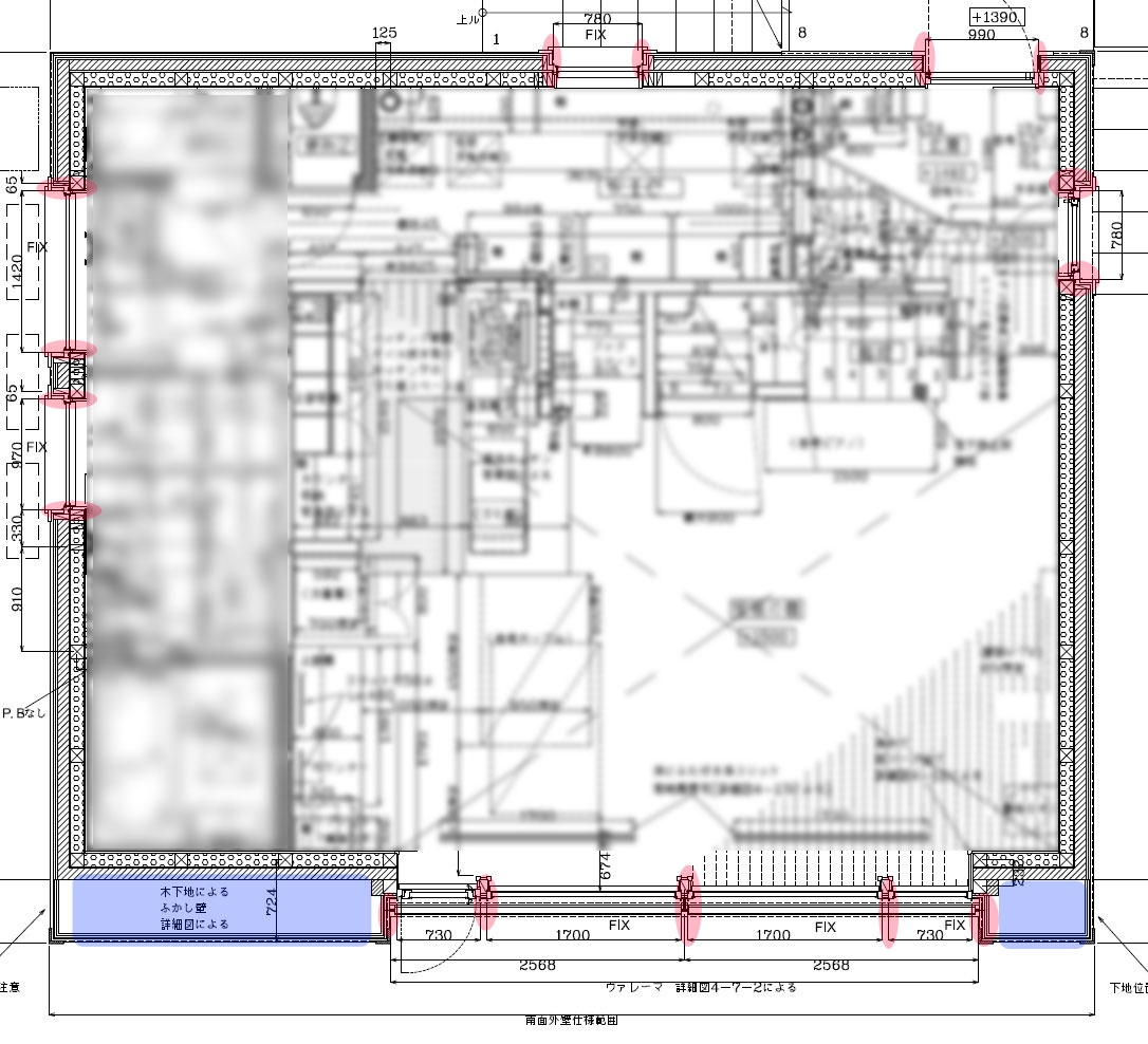 上は実際の「緑の家」の1階平面図である。ご要望で省令準耐火構造の適用を受けるための仕様になっている。通常「緑の家」では内装に木のむき出しの構造材があるためと余計なコストがかかるため省令準耐火構造を積極的に勧めてはいない。しかし今回省令準耐火構造を採用にするにあたって調べると意外なことがわかった。それが今回の題名の防火構造認定は付加断熱構造と相性が悪いこと。今回の話題は省令準耐火構造と防火構造の2つであり、一般の方には単語だけでも難しい話題であることを最初にお断りする。