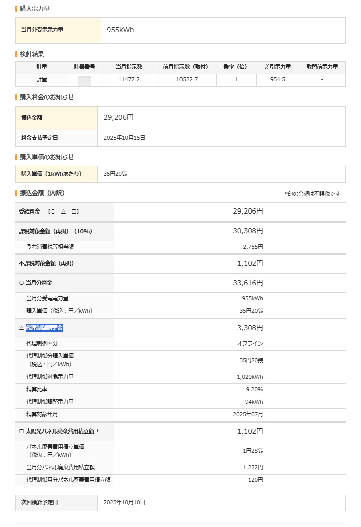 11年目の太陽光発電 2025/10/1(2週間前) 太陽光発電、風力発電, 築100年の「て・こあ」 0 わかっていたつもりだったが、いざ振込金額を見ると残念な気持ちになる。 これは11年経った「て・こあ」10Kwの太陽光発電の売電の表であるが、本来なら8月は売電金額が33,616円だったのに、7月に売電出力制御がかかりマイナス3,308円が8月分から引かれ29,206円だった。 続きを読む