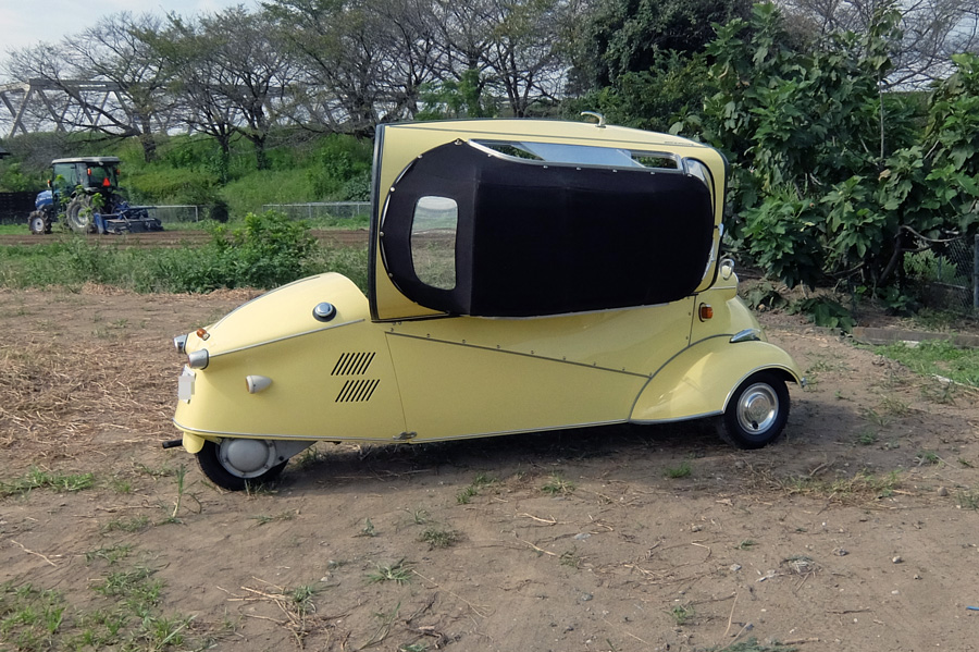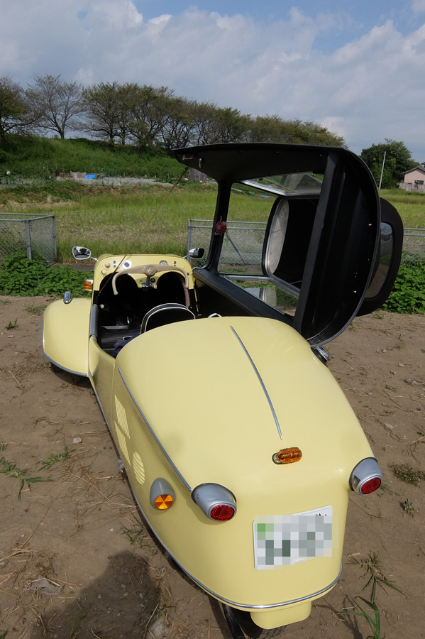 ドアがない車。乗る時には屋根(キャノピーと呼ぶらしい)を開けてのるのである。そして機構的に驚くのは、バックギアがないこと。通常は車重が250㎏もなく軽いので手で押してバックしているが、いざとなれば、エンジン動力を逆に取り出してミッション全体がバック推進機構となる。つまりエンジンを一度切り逆回転でエンジンを始動するためバックが1速だけでなく4速あるというギミック的な運転となる。エンジンを逆始動?て可能なのかと問われれば、このエンジンは強制空冷2ストロークなので問題はない。発電機(オルタネータ)も大丈夫なのだろう。