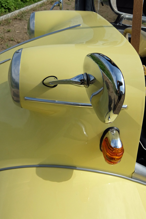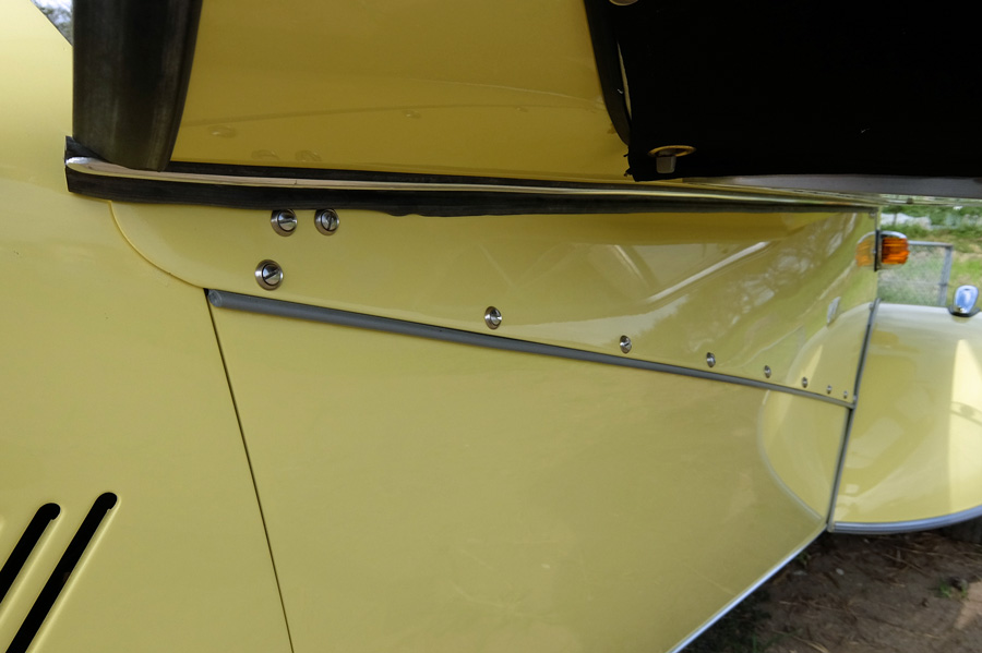 まず色が可愛い。この黄色は今の自動車に似合わないそんなクラシカルな色。そしてモールにみとれ各パーツのこの可愛さは特筆。私が小さい頃の自動車は、こんな感じで各板金の取り合いには必ずモールが取り付いていた。