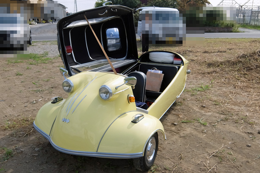 これは建て主さんの愛車で普段から乗っている車。名前はF.M.R Messerschmitt KR200 だと思うが、独製で2人乗りの車となる。70年ほど前の車で、その価値は博物館入りの車なのに普段使いできるところが凄い。しかもこんな未舗装でも乗り入れる。無論高速道路もOKでパーキングでは人だかりができるそう。これをご夫婦2人で乗って出かけるという・・・なんとお洒落でかっこいい。