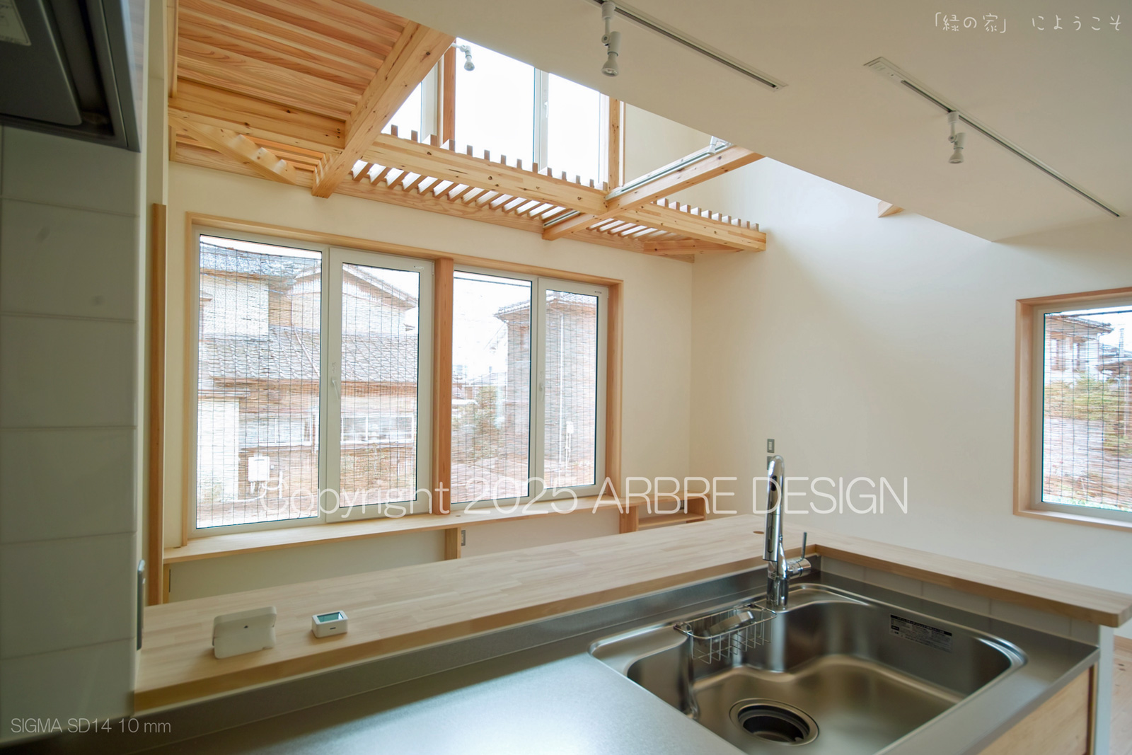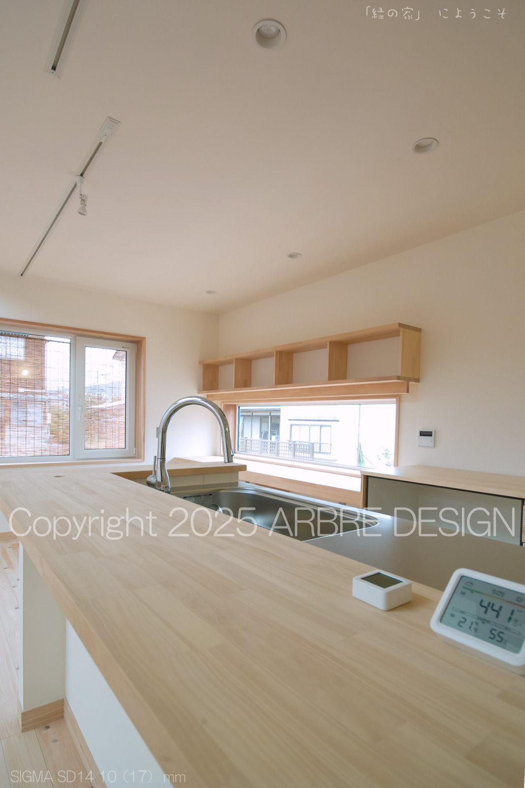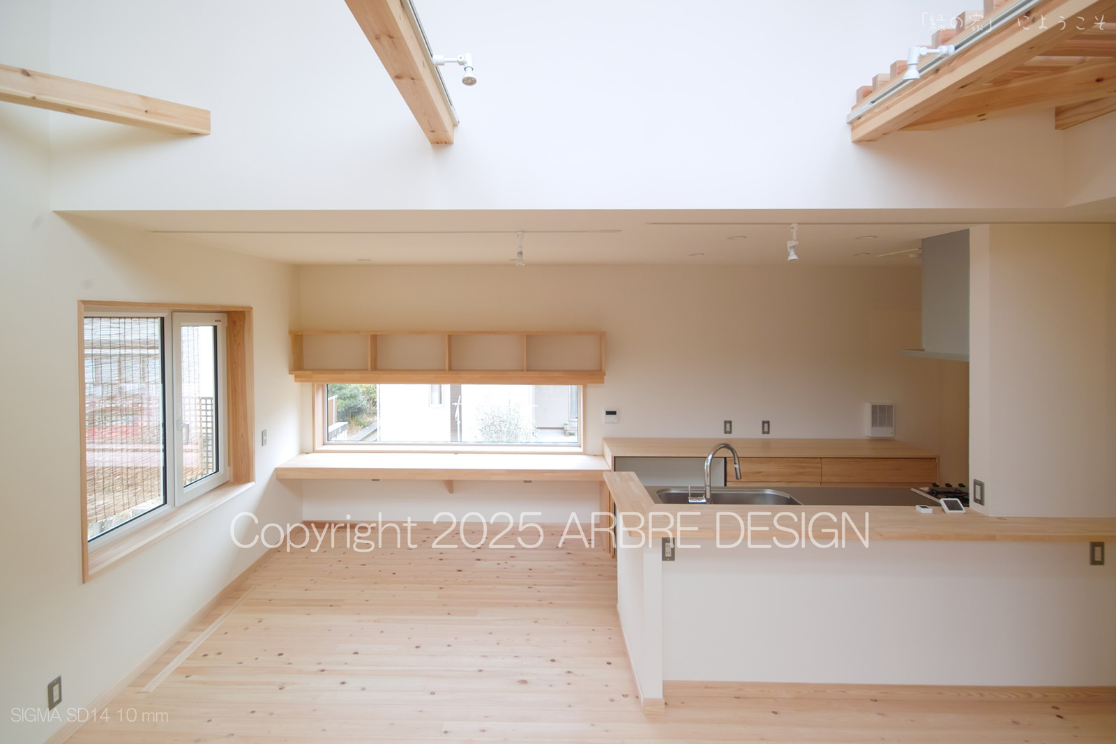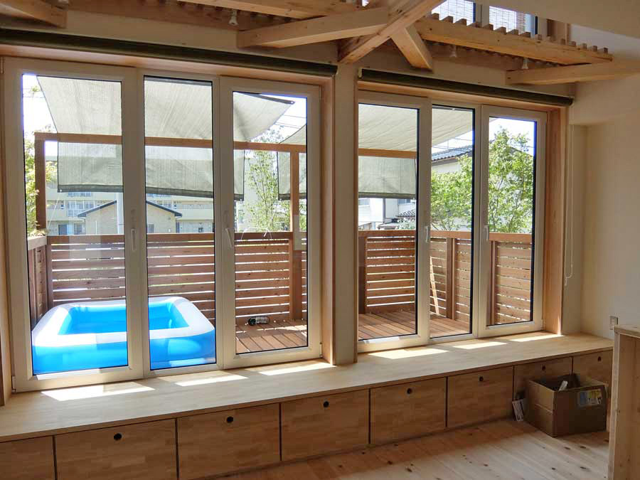 キッチン前には大きな窓が設置されるのでとても明るいし、将来その大きな窓先にウッドデッキをつくる予定なので、そこに上がる段をかねて長いベンチが設置されている。このベンチは現在の窓高さ(地面から1.9m)の危険性を排除し安全性を高くする。