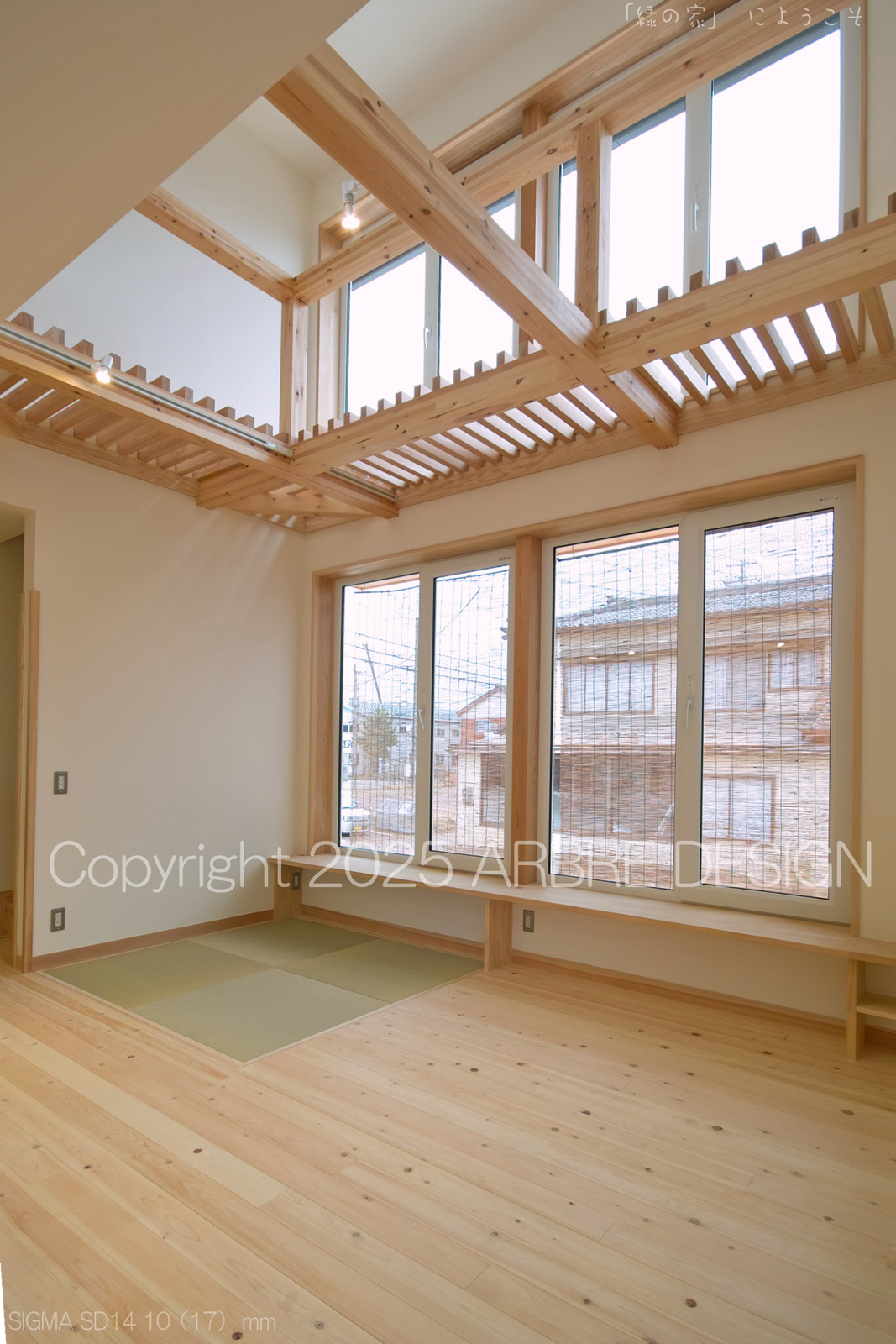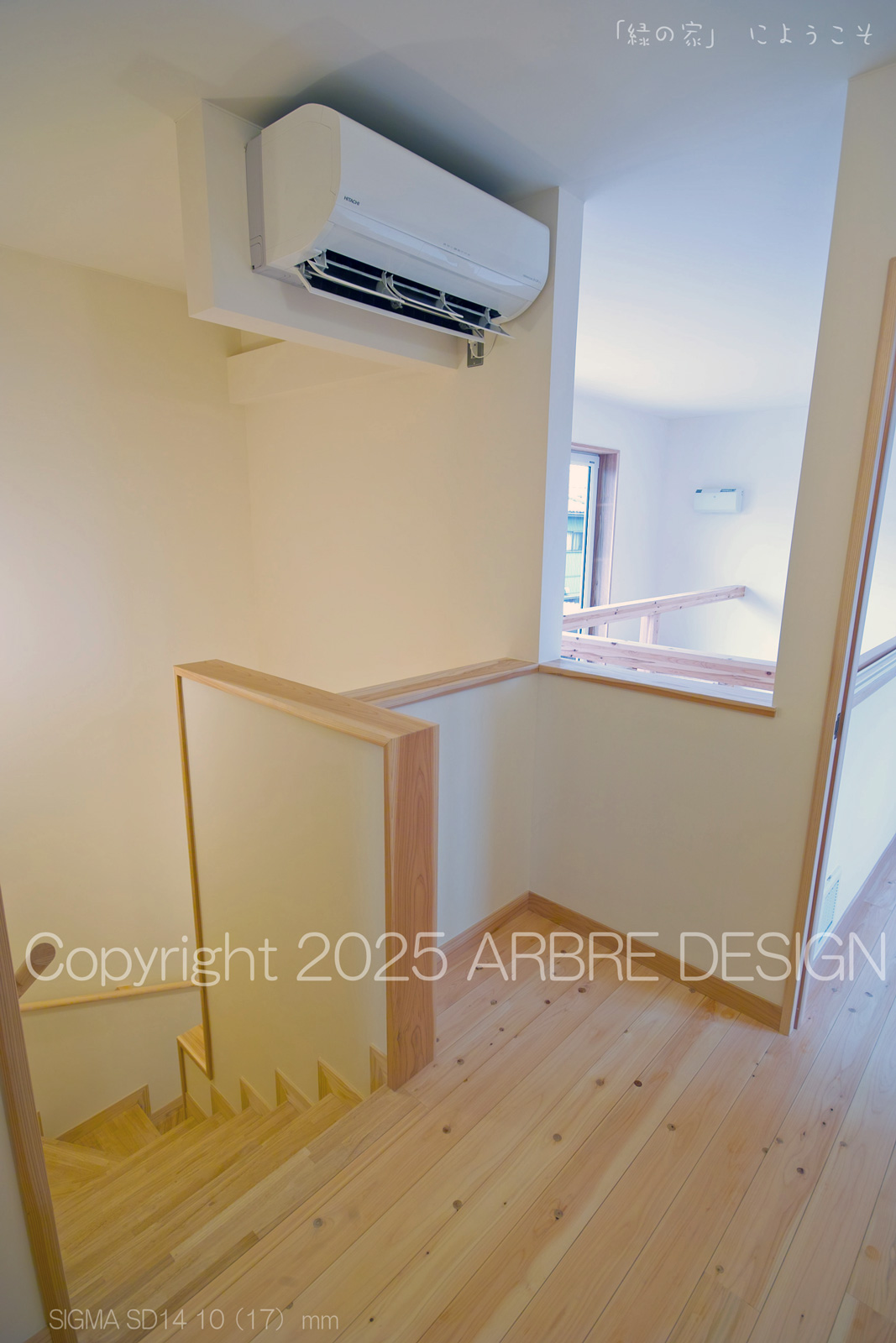 すぐ横に大きな吹き抜けがあっても冬期は2階に暖気は伝わりにくいところが、超高断熱住宅の床下エアコンを使った時の常識である。またこの写真の配置では、夏期吹き抜けから大量の熱気が上がりそれをエアコンが吸い込むので、その点でも除湿、冷房効率がよい。
