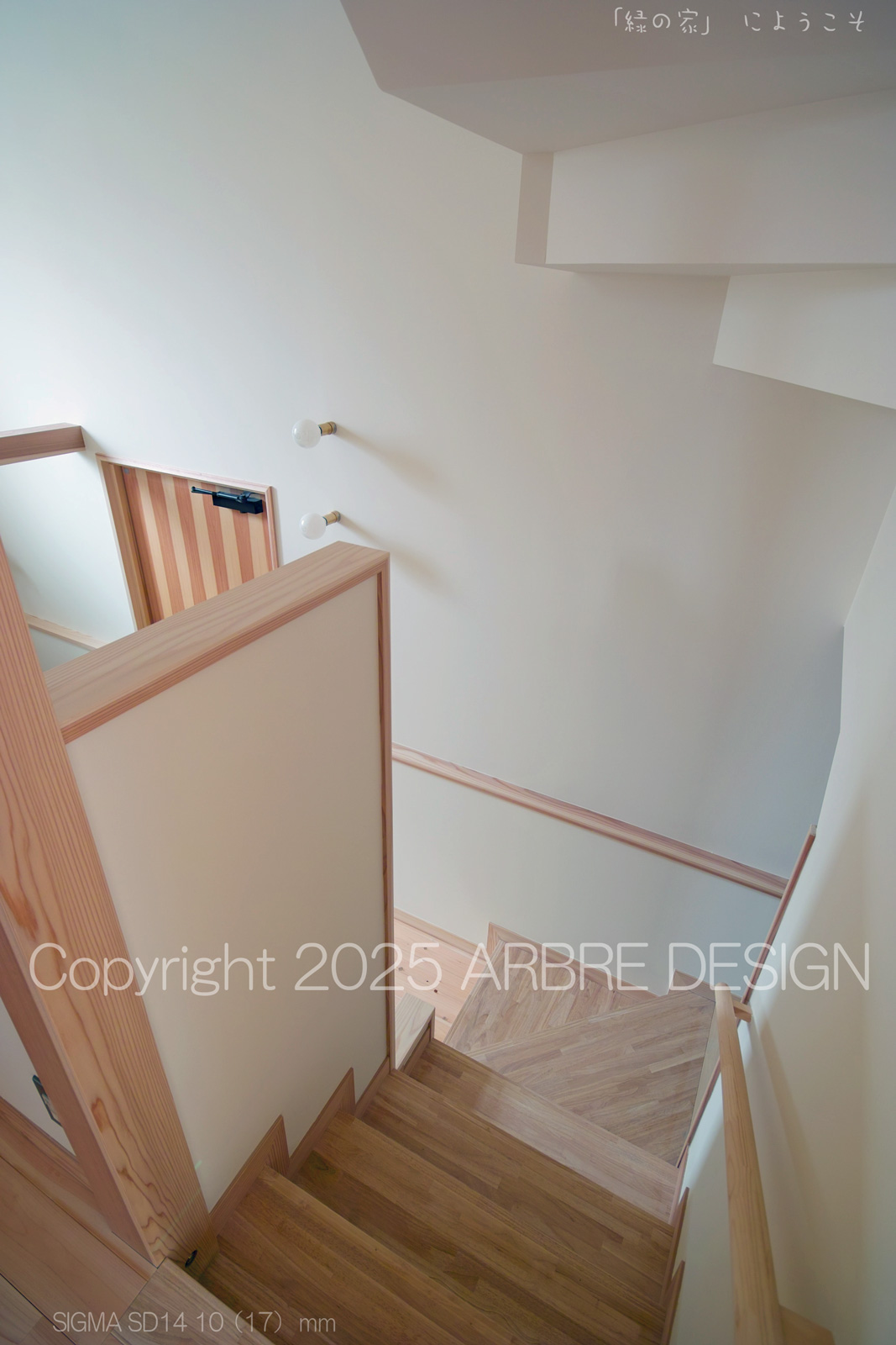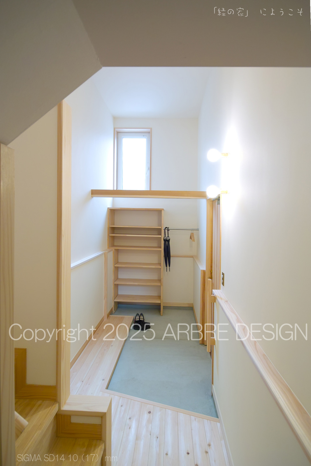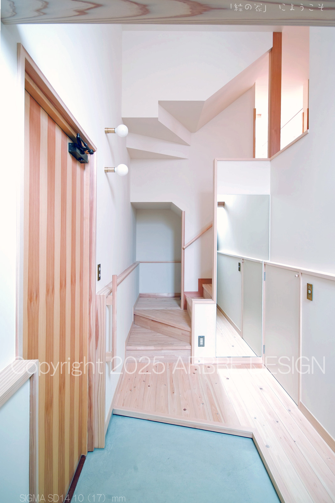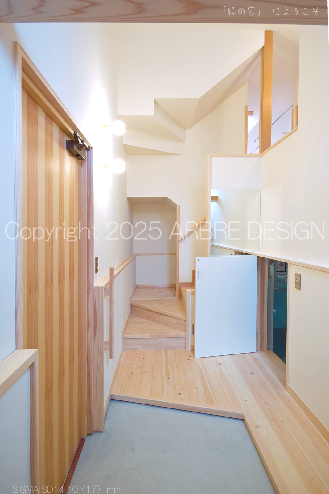 次に「緑の家」の特徴である地面とほぼ同じくらいの高さの低い位置の玄関のため、一階のフロアーには室内階段がある。
