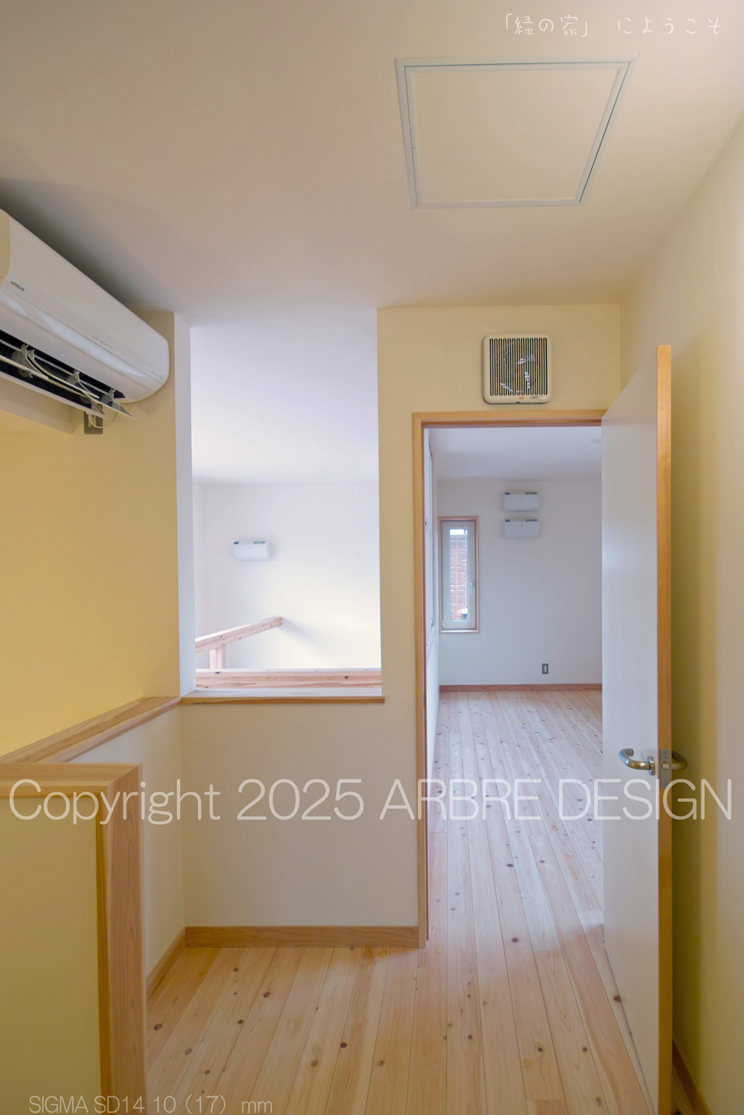 「緑の家」の冷房時の空調計画で最も多いのが、このホール型エアコンの設置である。夏期このエアコンで家中冷房を行う。しかも冬期でも床下エアコンの熱気が2階まで届かない厳寒期には補助の暖房として使うと、家の温度ムラがほぼなくなる。この補助暖房を使わないと一階が24度の時に二階は22度くらいになり、2度くらいの温度差が生まれることは、既に常識的なことであり。その点でもこのエアコンの設置は合理的である。