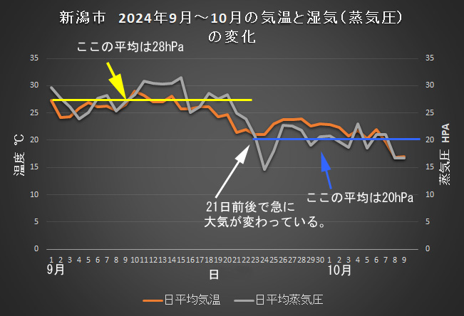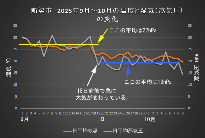所が9月18日を境にして大気中の湿気が急に下がり、9月前半(17日まで)の大気の平均水蒸気圧は27hPa(露点温度では23度)となる。その一方18日以降の大気の平均水蒸気圧は19hPa(露点温度では16.5度)となり、露点温度で6.5度も低くなった。このように大気はある一日を境にしてガラッと変わるのが新潟県の特徴。多分日時はずれるが本州の多くはこのような特徴がある。その一方上のとおりに気温は緩やかに変わるので湿度が急激に変わったことに気がつきにくいのである。