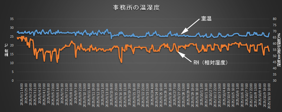 さて超高断熱高気密である事務所ではどのようにエアコンを運用しているかというと、いまだ冷房モードであるがコンプレッサーが動いて冷房を行うのは日射が入っている時だけで、曇りや雨ではONにならずまた夜間の6時間(21時から3時)はエアコンはストップしている。これでほぼ快適な温度25度から27度で、RH(相対湿度) 50から65%で推移しており、とても快適。これはRH(相対湿度)が安定して低いからであるが・・・