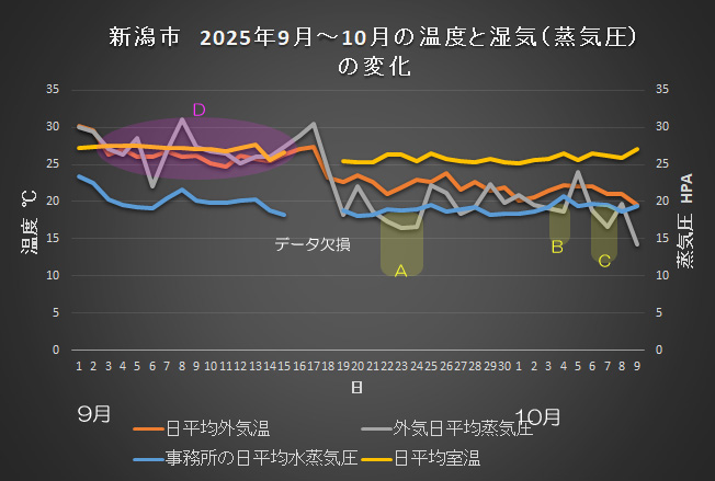 外気の水蒸気圧が事務所内の水蒸気圧より低くなるのはA,B,Cで9月の22日~24日と10月3日、5日、6日だけとなる。Dにおいても水蒸気圧が高いので外気の方がエンタルピは高い。