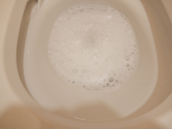 実はこの泡は洗浄に優れているだけでなく、使用時にも上から落下する水滴を包み込むように作用するため、水面からお釣りをもらうことが殆どなく、かつ使用時の液体跳ね上がりによる便座裏の汚れまで軽減してくれる。