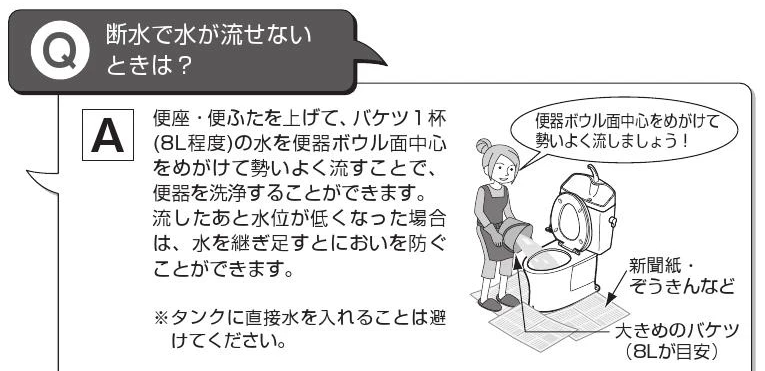 タンク分離型の現在の構造は上のとおりで、陶器製の内側に樹脂でできた容器があってその中に水が入っている。この為蓋を開けてもバケツで水を入れることはもうできない。つまり断水時には一体型と同じように便器本体にバケツで水を流しいれるようにしないと汚物は流れない。