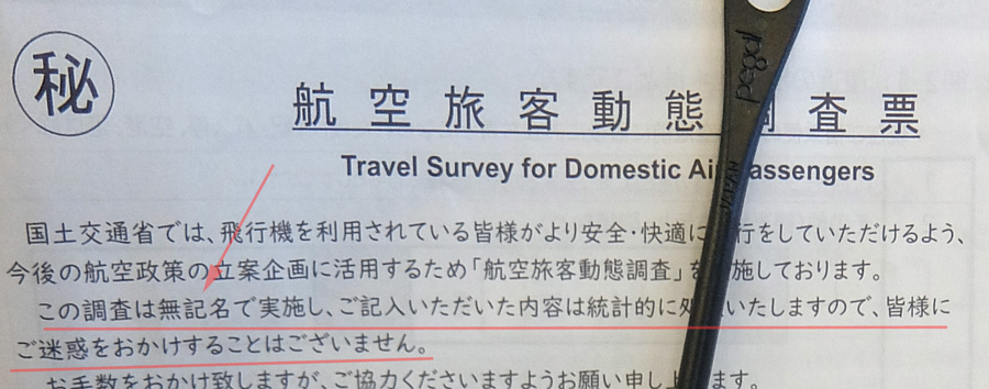 座席順に配られ、航空会社に乗客リストの提出を求めれば間違いなく個人を特定できることになる。問題なのは確かにこのアンケート用紙に書いてある「無記名」には嘘偽りはないが、プライバシー情報を取得するという宣言はない。嘘はついていないが、正しくもないような気がするそんな文言。