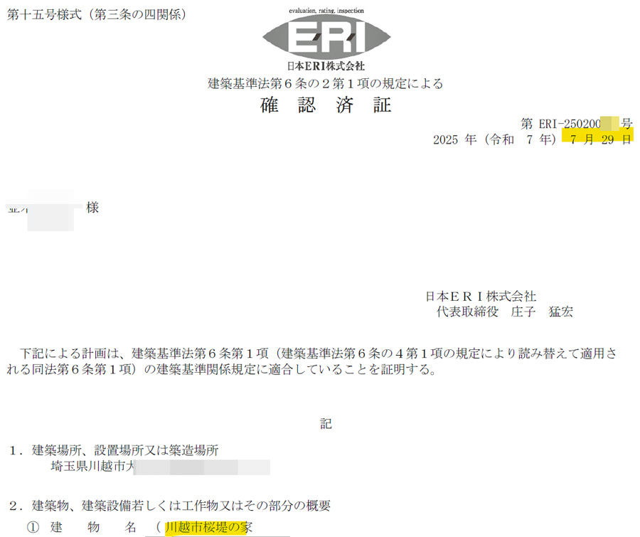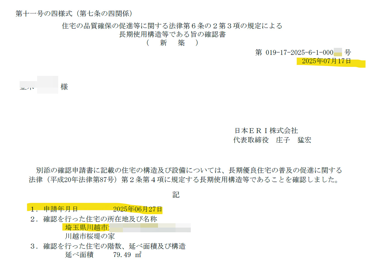 冒頭の川越市桜堤の家ではAに該当し、下のとおり長期優良住宅の技術審査の申し込みと同時に確認申請をERIさんに出している。下がその技術審査の確認書(審査済)である。