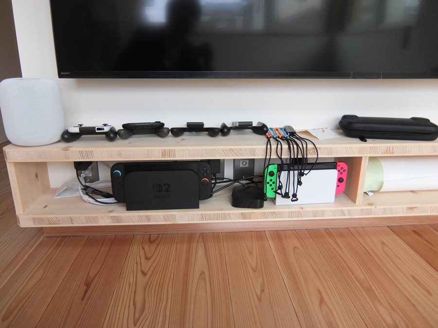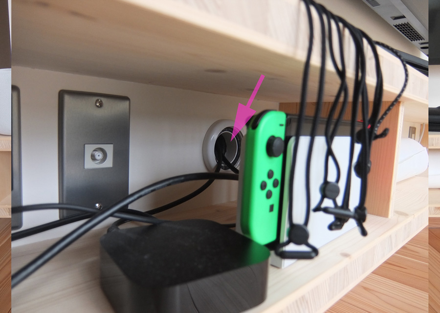 各種TVゲームがあっても壁掛けTVの下回りがすっきりしているいる。計画では壁穴40φから床下へ一度線を出し、それを床下からTV後ろまでつながっている40φもある穴からつなげている。私自身TVゲームしないので配線はわからなかったが、とにかくうまくすっきりいって良かった。ゲーム機も確か赤外線式だったような・・・。最近は赤外線リモコンが殆どで、黒い壁天井は注意が必要と理解した。