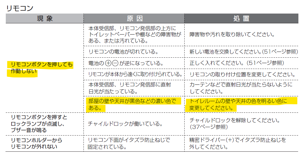 今回はリモコン位置を変えて対処したが、対処方法に「壁や天井の色を明るい色に代変更してください」と書かれていてもそれは無理だろうと思った。但しこの上位機種の便器なら電波式リモコンなので問題はないそうである。