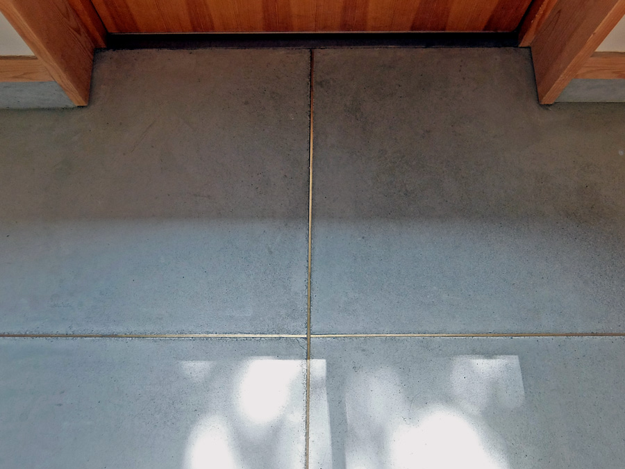 玄関床はモルタルであるが、真ちゅう目地が美しく光っている。雨がかりでないところでは靴底で擦るたびに磨かれるようで光っている。モルタルは経年変化で色が変わり始めている。