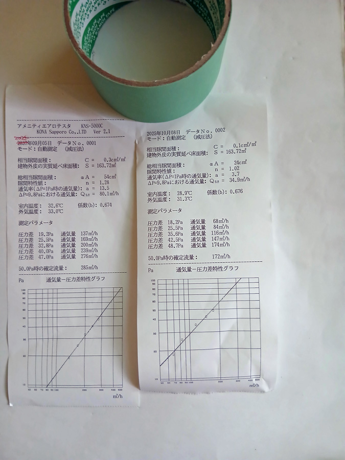 左がプラスターボードを貼る前に気密テープだけで処理した気密性能で右がプラスターボードで抑えた気密性能。0.2㎝2/m2も数値があがる。