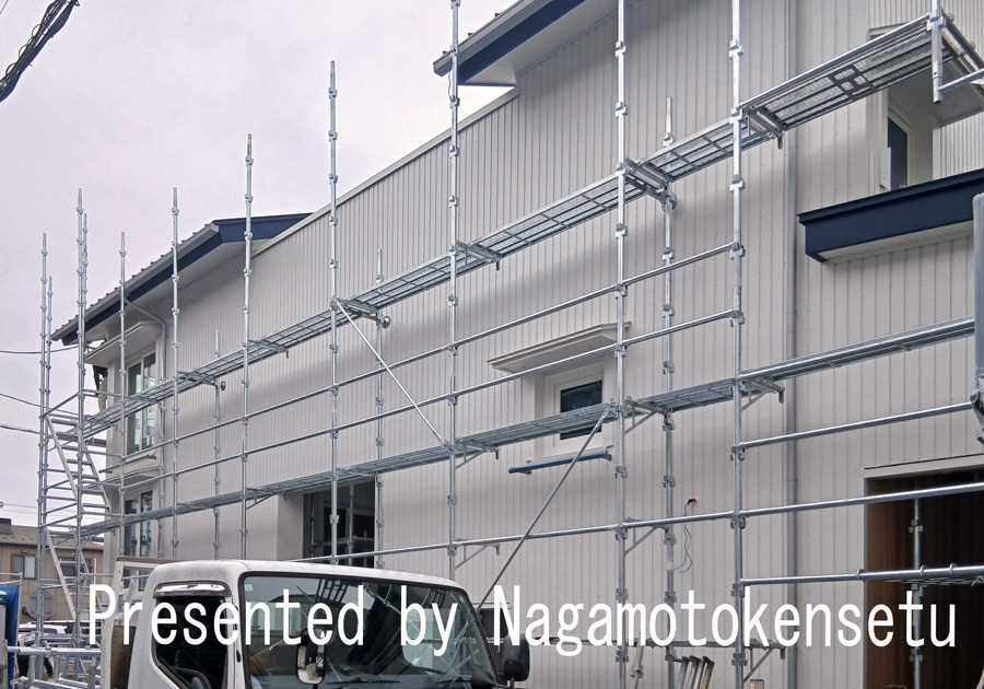 足場をばらし中。真っ白な外壁がようやく表れる。