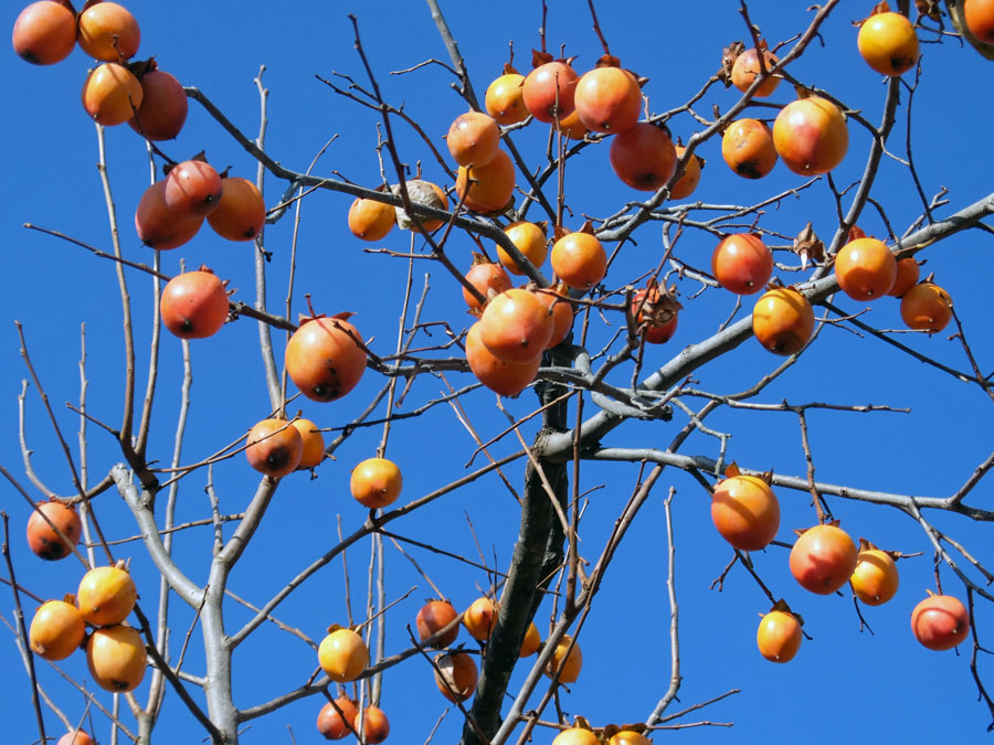 otomo vie centには3本柿の木があり、今年は玄関ポーチの柿がよくできた。疑似甘柿で、落ちてくる寸前の柿は甘くてとてもおいしい。渋柿を甘くした甘みとは少しちがい、穏やかでかつ嫌みのない甘さが特徴。私は甘柿の固い実が好きだが、この柔らかい甘い実も水切りヨーグルトに入れると大変おいしい。水切りヨーグルトがない場合は、クリームチーズならもう市販ケーキ以上のおいしさ。新潟県において12月の晴天は珍しく、柿と青い空を見上げると幸福な気持ちになるが、雪はもうすぐである。