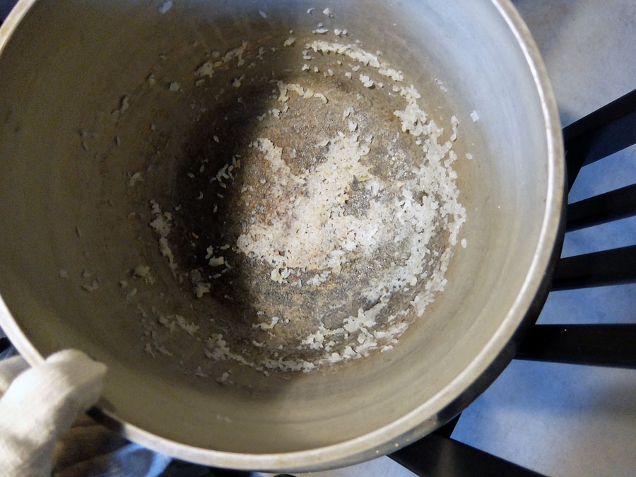 焦げると固いところが混ざり触感に影響がでるし、何しろこのように無駄になるお米が多くなる。昔はこれに水をいれ御粥で食したはずだが、その習慣は今はもうない。