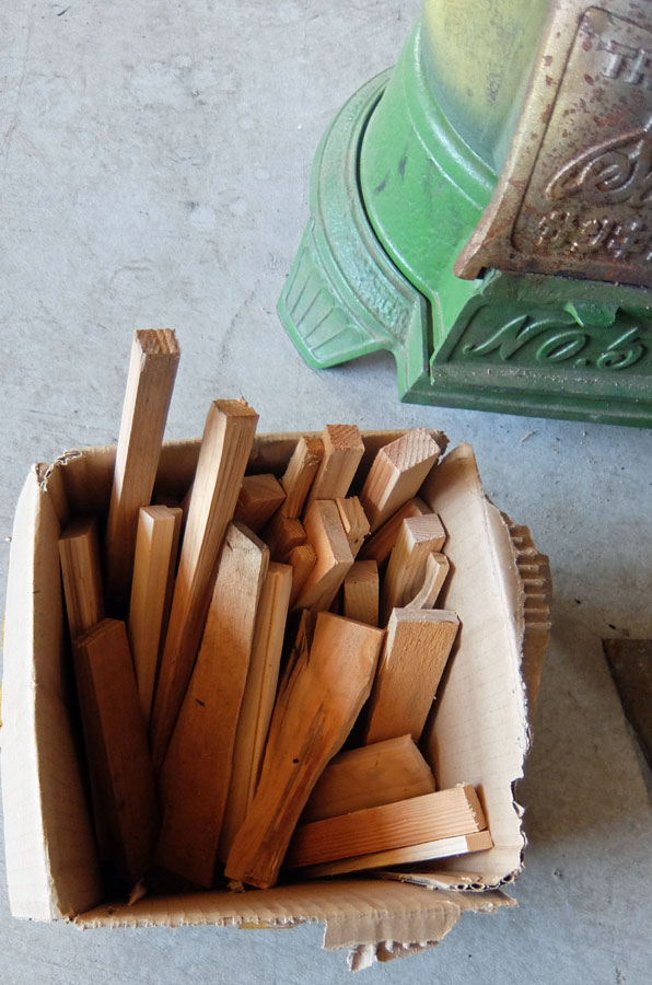 竃を使う時は薪ストーブと全く違う木を使う。大体がこのような小片にした針葉樹である。このほうが炊き上がの火力が自由に調整しやすい。一方薪ストーブでは広葉樹の太く大きい木が主力。昔話で「おじいさんは山にシバかりに、おばあさんは川に洗濯に・・・」とのくだりでシバ(柴)かりとは小枝拾いの事で、煮炊き専用の木となる。