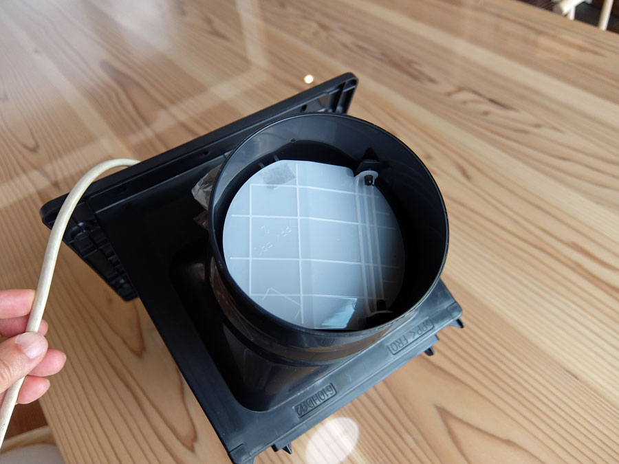 まずは低風量型換気装置で風量計の特性を把握(簡易校正)する。この換気扇はあるところまでの機外圧損までは常に定風量で出し続けられる特殊な換気扇。通常の換気扇は圧損に応じて風量が落ちるため、正しい風量を得ることが難しいが、この換気装置は一定の風量を出し続けることが可能。