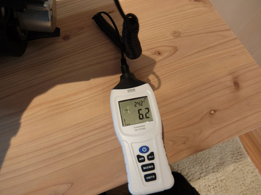 最後に風速計の直径と風速から求められる風量がこの数式と著しく違っていないかを確認して終了。また圧損が殆ど発生しない微風速計で同じ風速を測ることで、求めた風速と風量の関係同じくなるかも行うが、風速はダクト中央と周辺では大きく乖離するのであくまでも予備的に使う。これで一応24時間のダクト換気専用の簡易の風量計ができる。