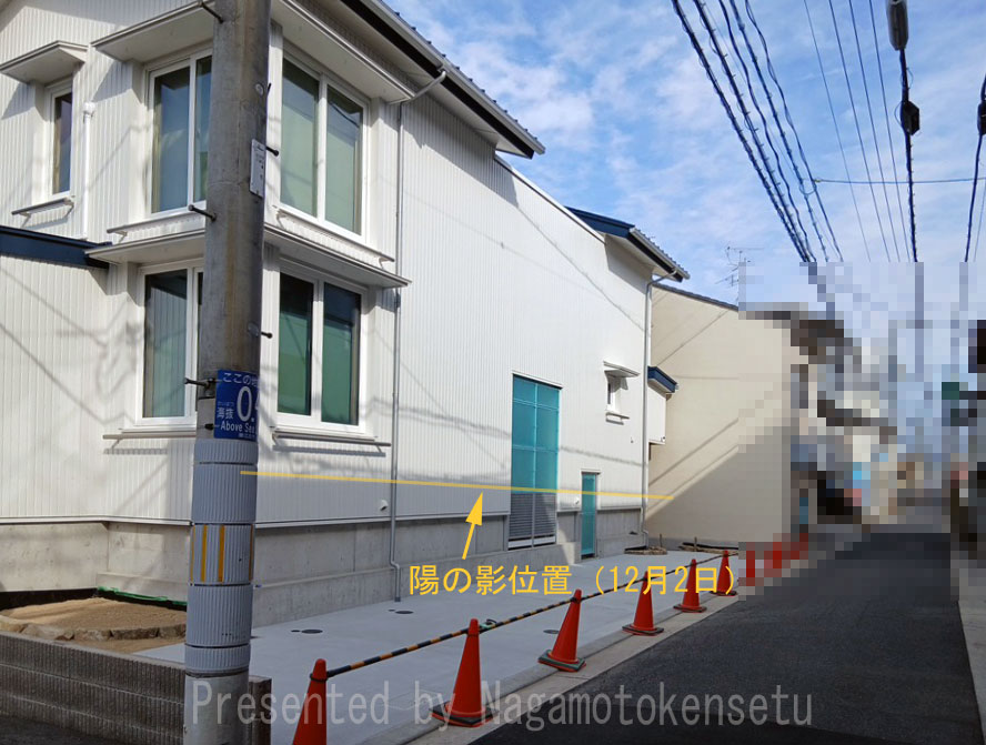 上の写真は12月2日13時ごろの写真。日射の線が一階の窓上下にあり、この住宅がひしめき合う場所で効果的に冬至に近い低い日射を拾っていることがわかる。またこの写真を見る限りあまり窓が無い建物のように見えるが・・・