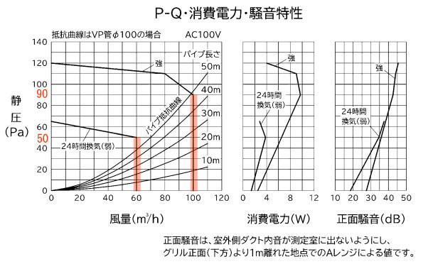 この特性を使ってその時の風速で風量を推測する。先にお断りするが風量測定は大変難しく、特にダクトでつながっている換気量を正確に測るのは至難である。どこかに風量計をとりつければその場所だけ圧損があがり、他の出口の風量が増えることになる。よって風量計の圧損と測定のために取り外したグリルの圧損があまり変わりないことを当初確認するのがよい。また測定する換気扇本体も圧損に対して余力があり静圧が高くでる機種が前提となる。その際換気扇本体も定風量タイプであればベストであるが、住宅用換気装置で定風量タイプはデシカしか知らない。