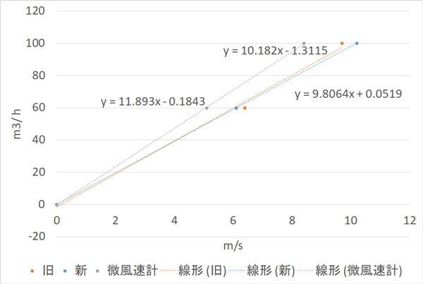 風量が一定になるのでその時の風速を3点でグラフに載せて数式をつくり25、30、40、50、60、75m3/hの風速を推定する。