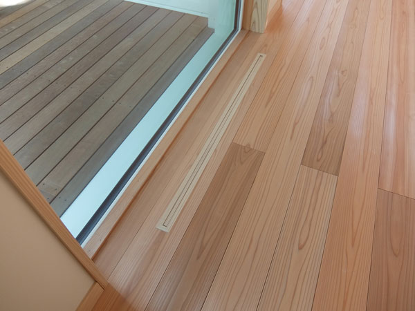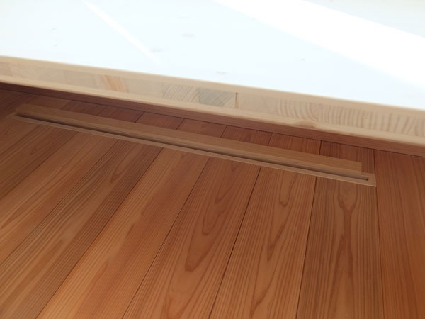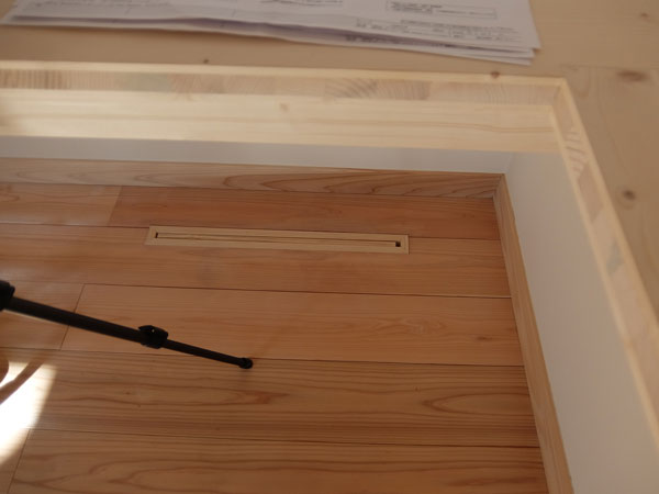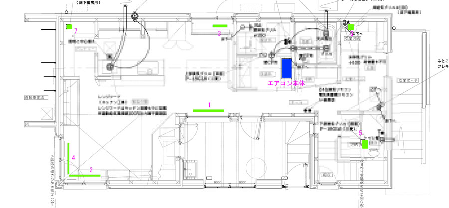 床下エアコンと各吹き出しの配置は上の図のとおりで、吹き出し口は大小合わせて7つもある。最近の「緑の家」では数が多い計画である。エアコン本体は建物中央から右寄りの定番の洗面所に設置されており、吹き出し口は大きなサッシがある真下でコールドドラフトを防ぐ目的で1、2、3、4を設置。また建物4隅まで均一に暖かくなる目的で2、5、6、7番が設置されている(2は兼用)。