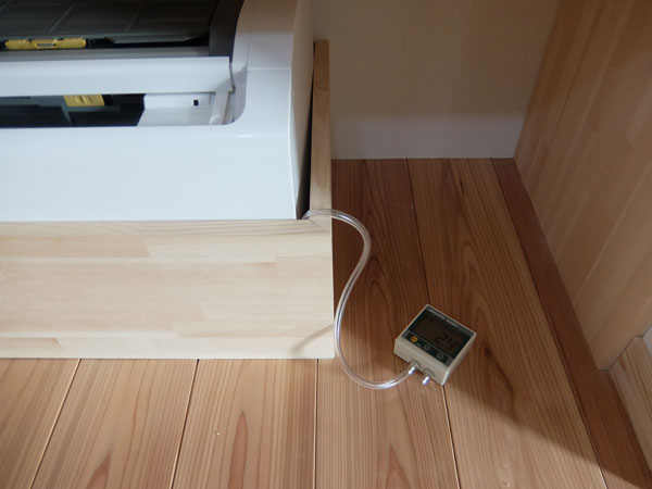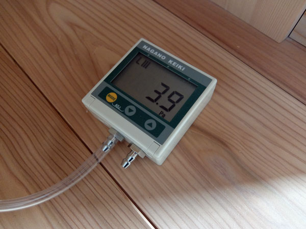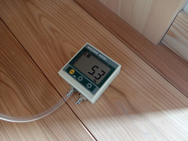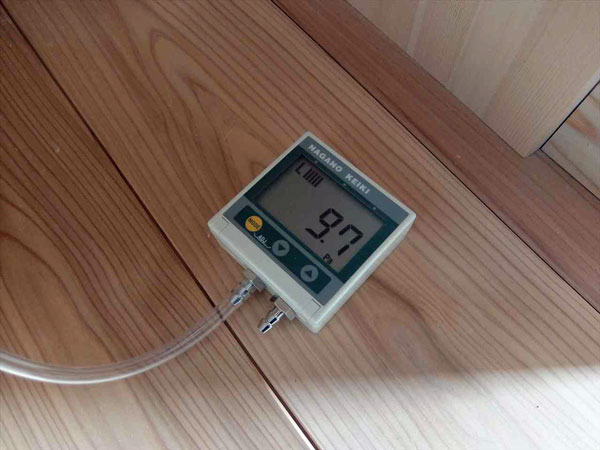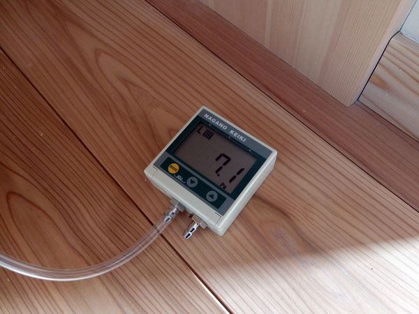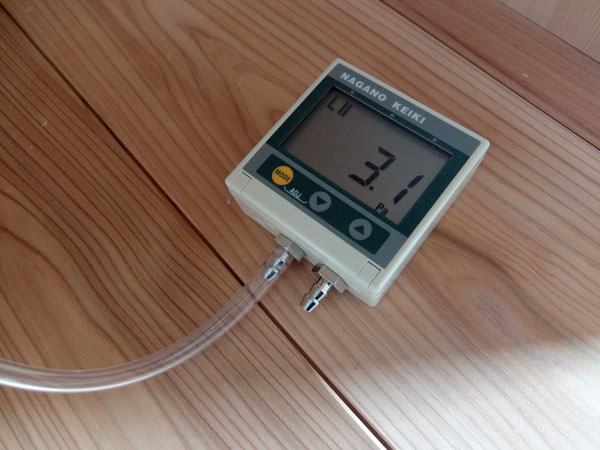 既に7日間以上床下暖房を稼働し、室内温度や一階床面温度が均一になることをサーモなどで確かめた上で微差圧計によって床下と床上の圧力差を調べる。