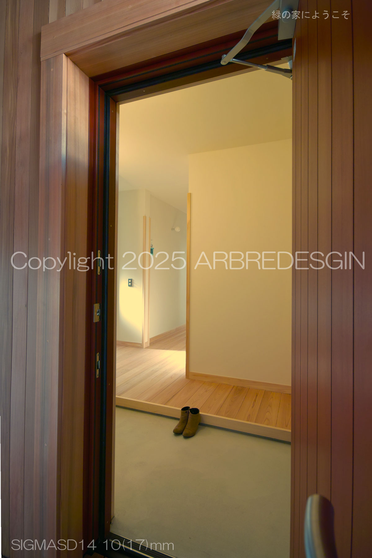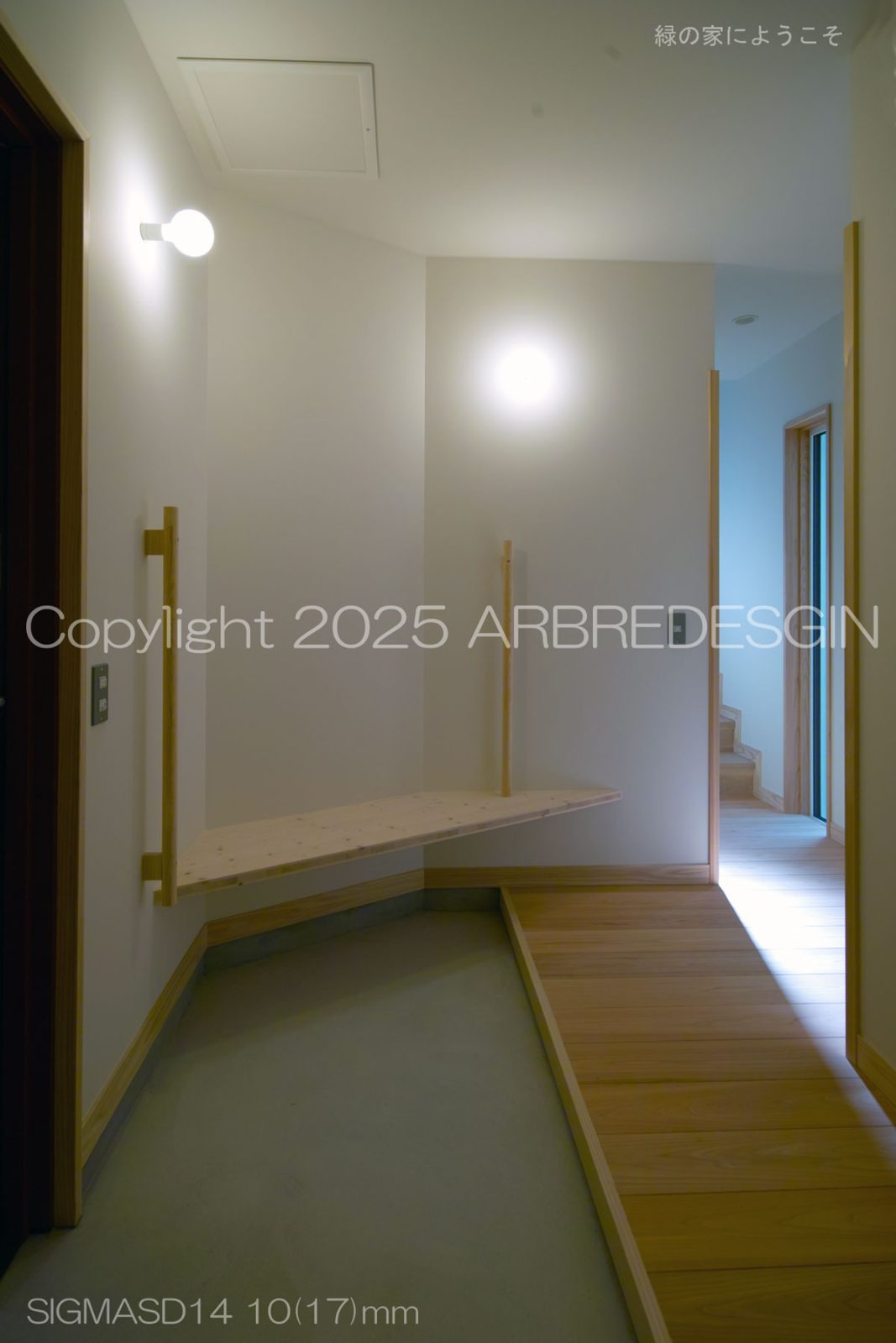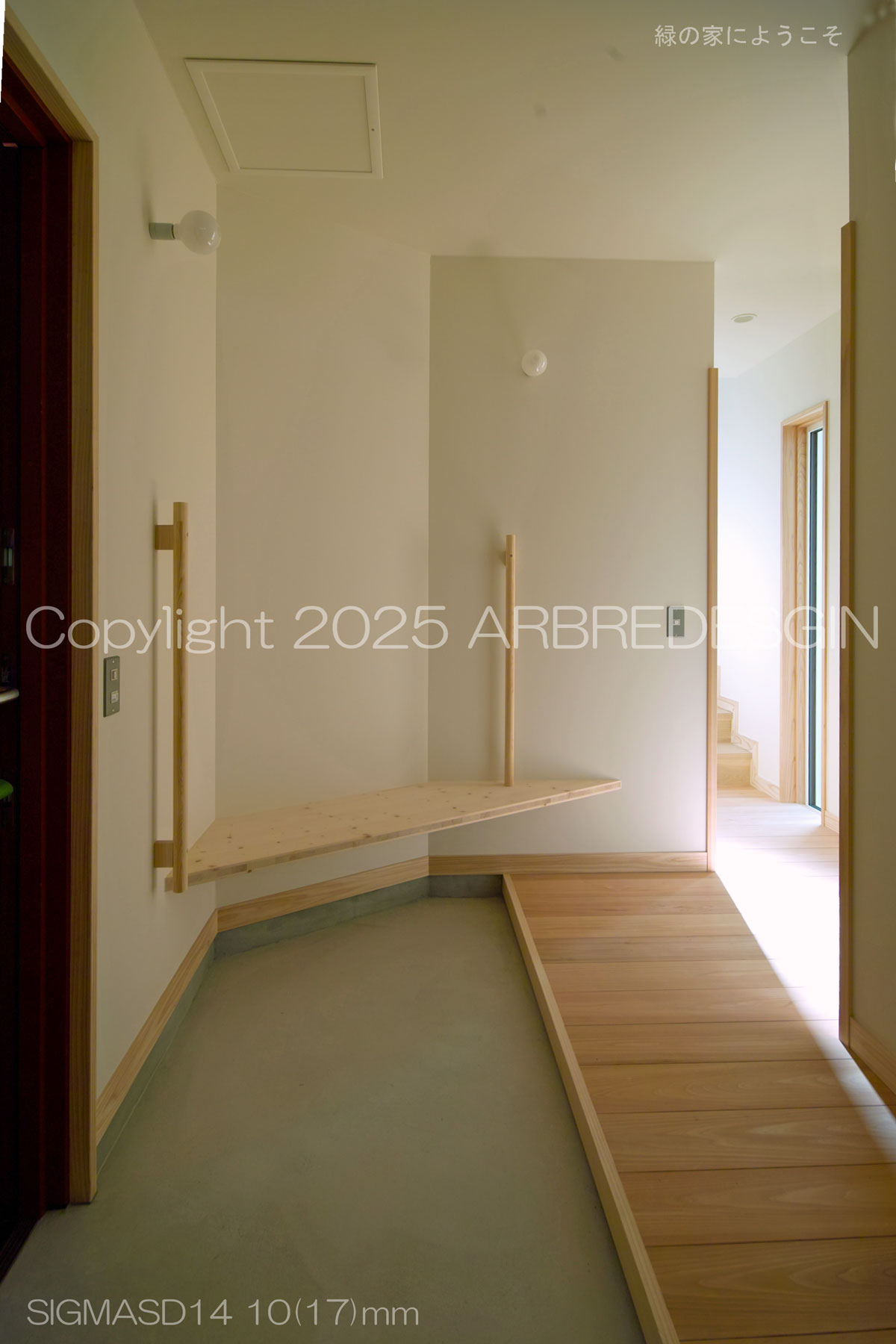 室内は淡い光が差し込む。この玄関には直接窓はないが、冬季は日射が傾き奥まで差し込む性質を利用し、階段の中間部に窓を設け廊下に光が差し込みそれが反射して玄関が明るい。