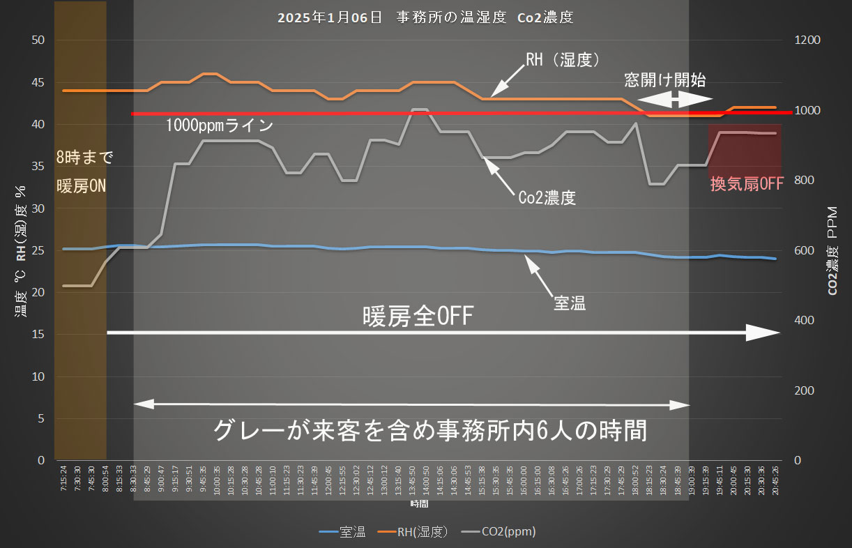 換気風量も平時の3倍の170~180m3/hくらいになるので、下のCo2量が示すとおり白熱?した議論や打ち合わせを行っても1000ppmを超えることはない。但しお昼ご飯時にわずかに1000ppmを超えているがこれは6人の活動量が同時に増えたからであろう。
