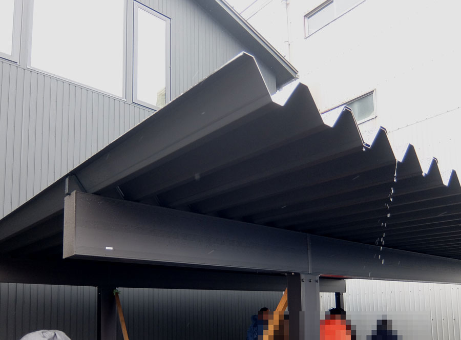 ご覧のとおり事務所の外観は完全な黒一色のため、カーポートも黒一択となっている。しかも屋根と柱の色が黒、白やシルバーのどの色を選んでも、屋根裏面の色は通常全て同じアイボリグレーに対し、裏面も黒となるものを選択しているので全体が統一感がでて美しい。