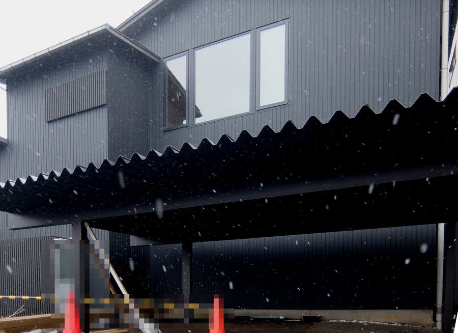 しかも折板屋根(ガルバニューム)であるため裏表の色が黒で同色一致すると工業美を感じる。この為通常取り付く幕板(破風や鼻隠し)を取りやめ雨どいも特注して黒の機能美がそのまま表れるようにしたいと計画変更した。作業している方から「本当に?これで御終いでいいのか?」という驚きの返事をされたが、私のポリシーで「いつも見ている又は行っている方法がが良いとは限らない。疑って考えてみろ」があるので、普段ではあり得ないこのままの形で完成させる予定。これは今後の鉄骨造の「緑の家」にもつながることで、後日紹介したい。