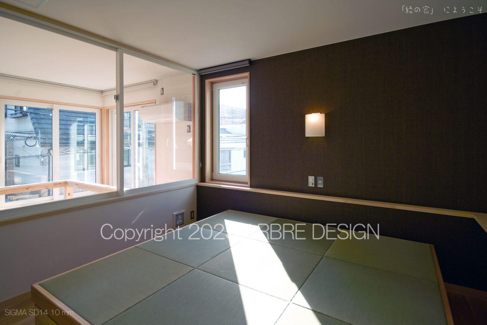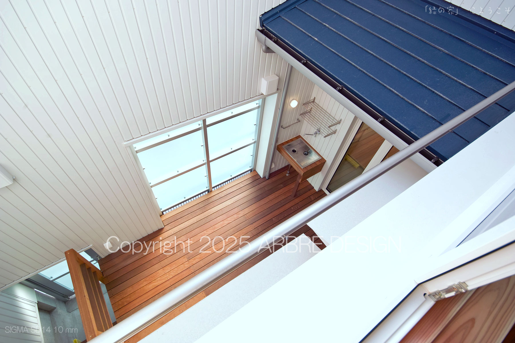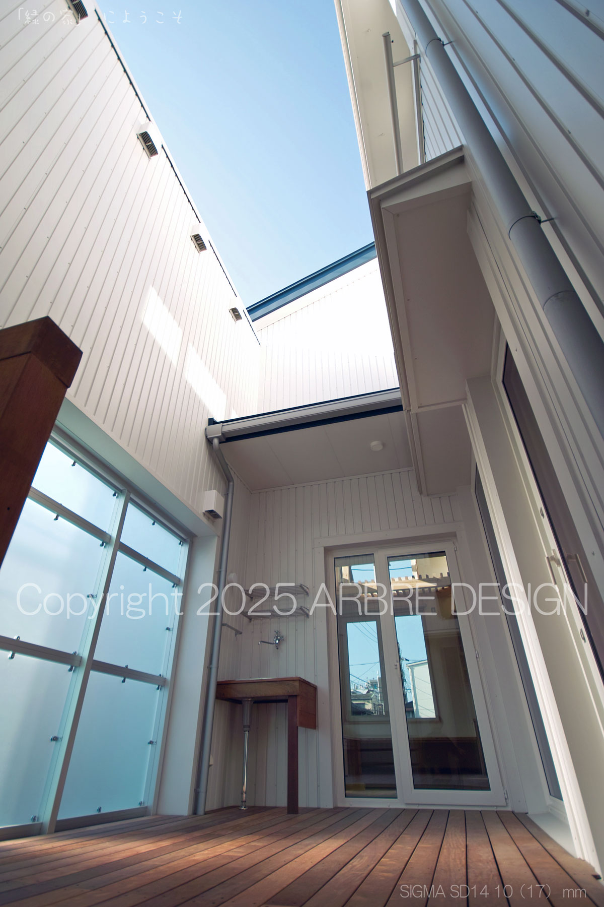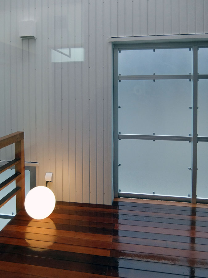 上写真のように少し斜めになるのだが、光庭に置かれた照明と置く予定の鉢植えの木が見えるようになる。そして目線を中央に戻すと町に開かれた窓と中の閉ざされた外部に開かれた窓を同時にみる。