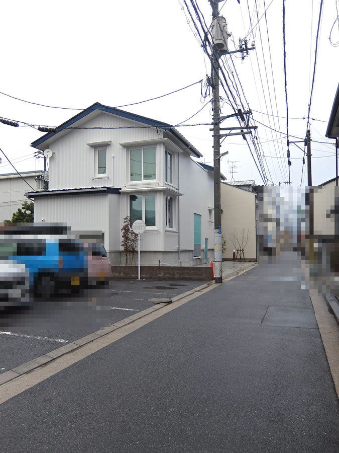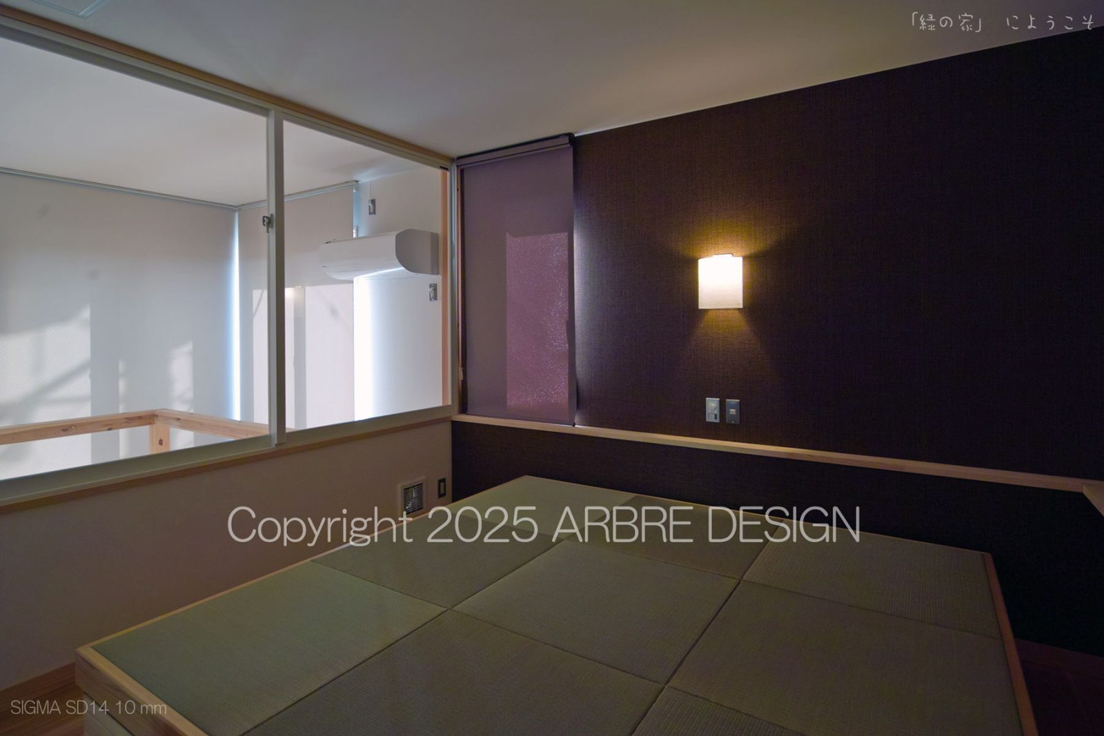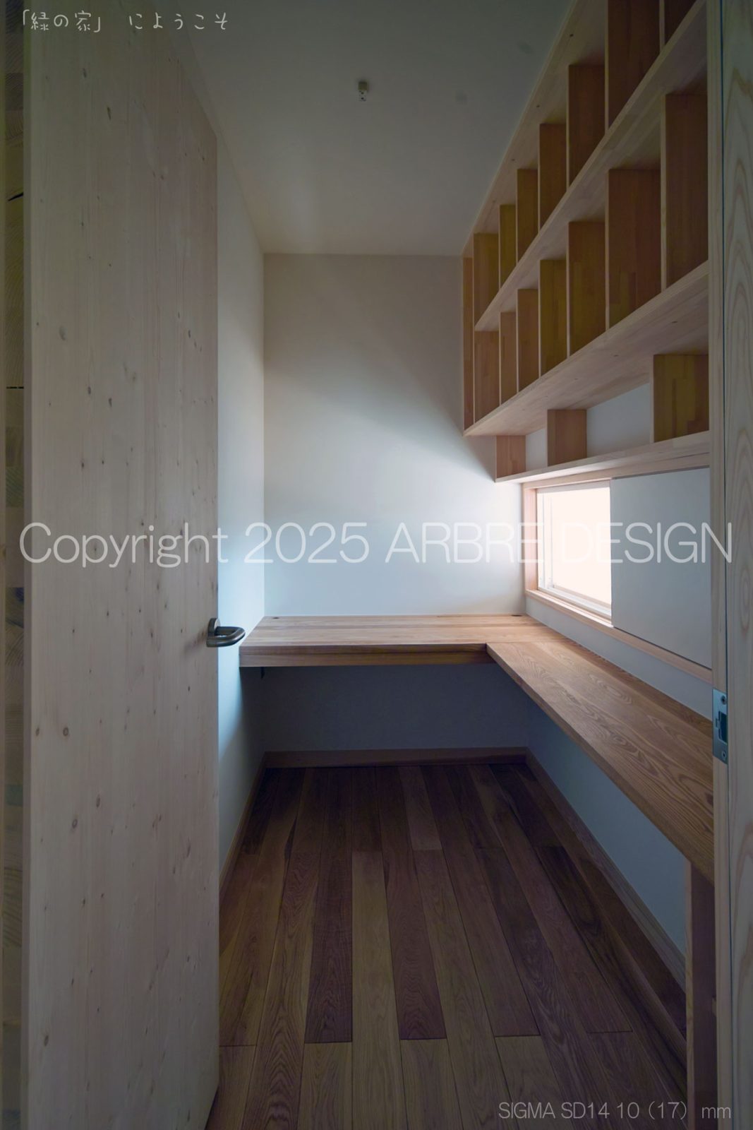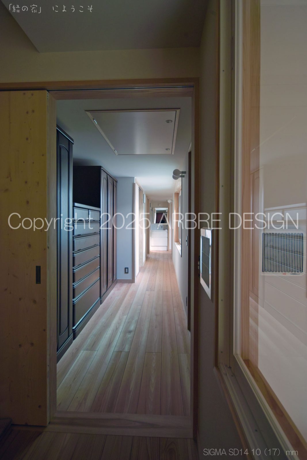 上写真のように少し斜めになるのだが、光庭に置かれた照明と置く予定の鉢植えの木が見えるようになる。そして目線を中央に戻すと町に開かれた窓と中の閉ざされた外部に開かれた窓を同時にみる。