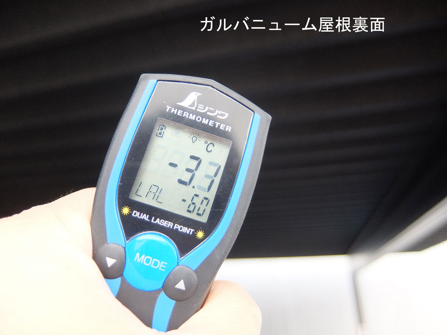 つまり氷点下0度付近と考えられるので、結露をすることになる。一昨日の外気は気温6度で露点温度は2度になっていた。この撮影時には気温6度で露点温度が氷点下1度時、ガルバニューム屋根の裏面表面温度を測ると・・・