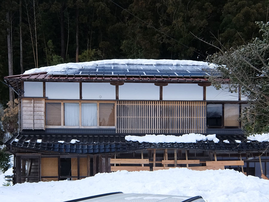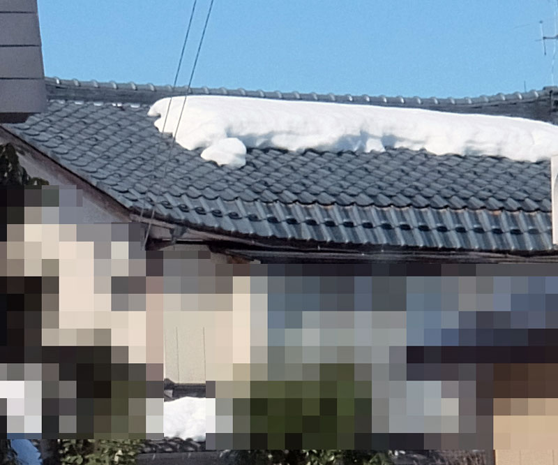 太陽光発電のパネルに積もった雪が一気に滑り落ちて下屋の屋根を破壊した。この時はただ単に雪があまりにも一気に降り続いて80㎝の雪が一気に落ちたことだが、今年は数日掛けての落雪で起こっている。