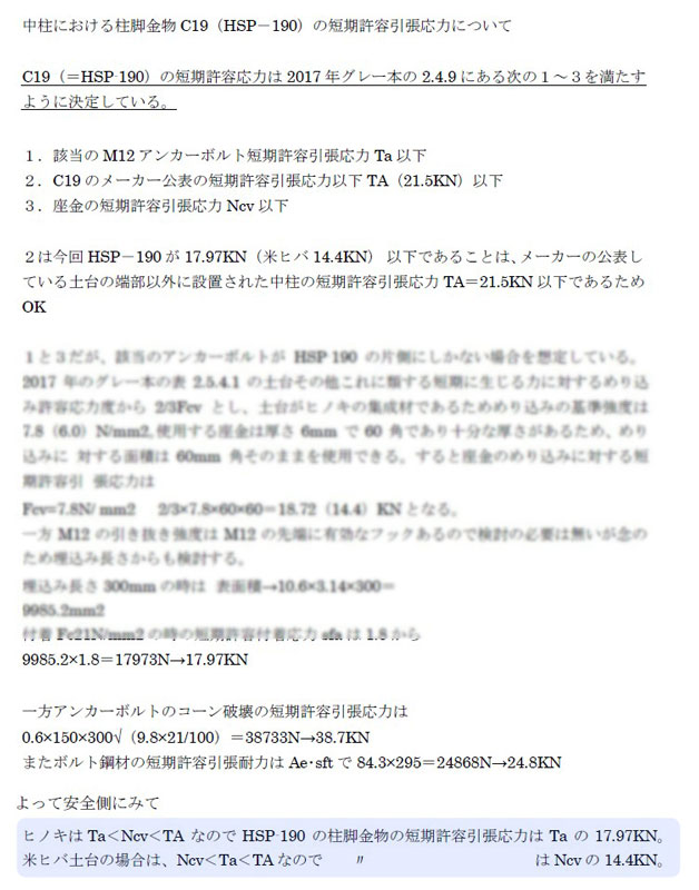 L=500 を使うことで埋め込み深さを300mmを確保して、最も弱い因子であるアンカーボルトの付着力をアップしている。確認申請時に添付しているアンカーボルトM12のエビデンス計算は以下のとおり。たかがアンカーボルトだが最も重要な検査項目の一つである。汎用のアンカーボルトでは埋め込み深さはとても重要なのである。