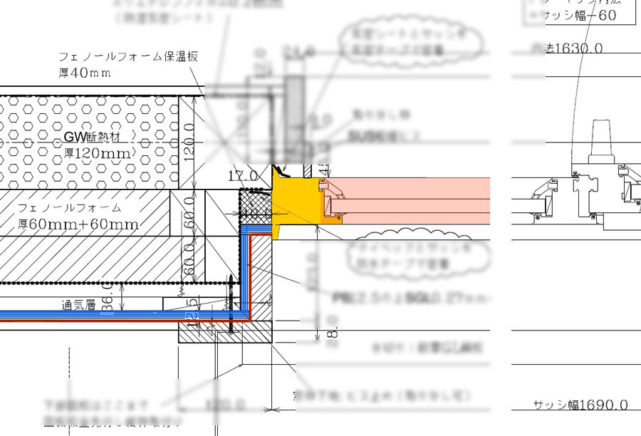 超高断熱住宅では付加断熱が必須になるので、この開口部の納まりは①外壁と同面納め ②外壁よりバックして柱納め・・・の2つあり、断熱性を厳しく追及すると②の納まりが優勢となるので採用されている人も多い。「緑の家」でもこの②は断熱性及びサッシ取替え時のメンテナンス性でメリットがあるので必須納まりとなる。この納まり時に認定防火構造が防火構造としてはNGとなる。