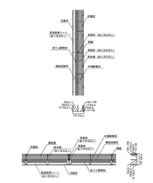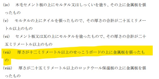 難しく書いたが、簡単には外壁には厚さ12.5mm以上のプラスターボードを下地としてその上に金属板を貼ればOKというとても汎用性の高い仕様である。