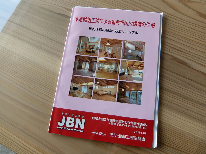 とのことで、発端は住宅金融支援機構が定める基準の住宅であり、簡単には外壁と軒裏が防火構造以上で内装では天井が強化PBで壁がPBとし、ファイアーストップとコンセントプレート等が火が抜けないものを選択する。内装の方は下地にあればよく、木の仕上げもできる事が建築基準法の内装規定とは違う。但し内装において構造材はむき出しは原則禁止であるため、吹き抜けに木が露出する「緑の家」ではとても使いにくい仕様である。その欠点を取り払ったのが、JBN(全国工務店協会)仕様の省令準耐火構造である。
