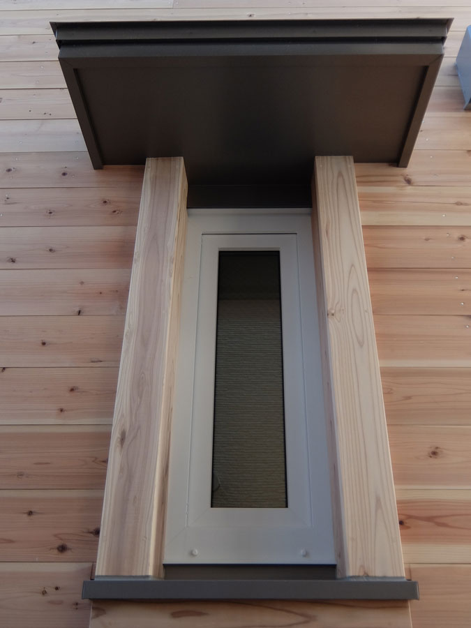 上は「緑の家」Aグレードの開口部廻りの詳細図である。青線はPB12.5mmで赤線が金属板である。つまり省令1359号防火構造ではこの組み合わせがあれば内部構成や外部構成は問わないとの建付けに対し、認定防火構造の外壁では、このように折曲がった外壁端部となる開口部の一部をフォローできない。内部構成や外部構成が変わるからNGになる。省令1359号を使っているので、下のような木の開口部一部をデザインできるのである。