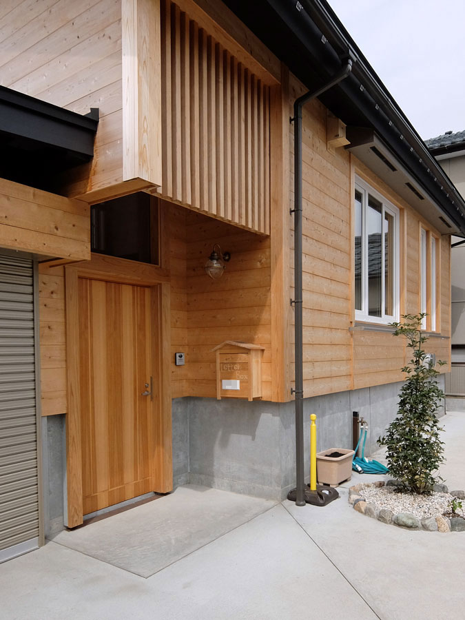 準防火地域に建築されている「緑の家」。省令1359号を使うので木の玄関戸枠、外壁役物、格子、サッシ枠等に木を使える。