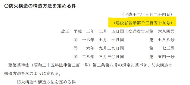 まず「緑の家」が普段使う防火構造はAのみ。これを法文で見ると有名な告示で1359号になる。