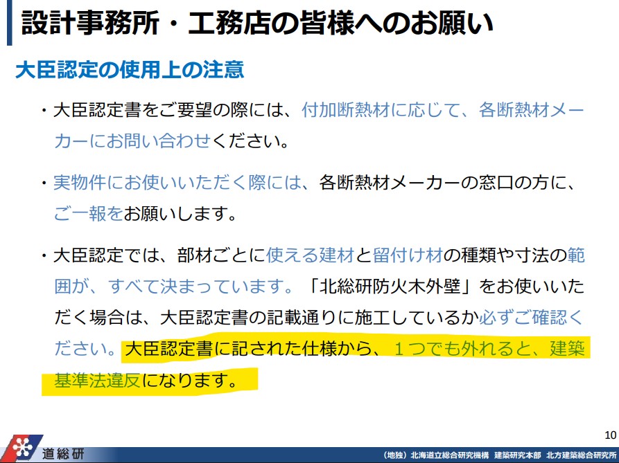 その一方Bである認定された防火構造は汎用性がなく、認定時に取得したその外壁構造を一つでも逸脱すると建築基準法違反となる。仕上げ材の厚さ一つ変わっても(15mm未満)NGであり、下は木造の木の外壁の認定防火構造の主体となった道総研のHPでの注意喚起である。