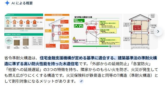 蛇足だが・・・省令準耐火構造の外部の防火性能は防火構造に比べ著しく劣るといえる。これは火災現場を見たことがある人ならわかるが、隣家からのもらい火はほとんどが窓からの火の侵入と軒裏からの火の侵入である。外壁はそこそこの性能でも窓ガラスが熱で割れたら、火は一気に侵入することは明白である。その窓の防火性能は問わないという事が?になる省令準耐火仕様。また軒裏換気口にも防火規定を持たない省令準耐火仕様は実質もらい火には弱いといえる。