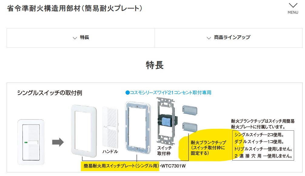照明スイッチが樹種プレートの場合、通常のプレートは使えず上の簡易耐火プレートとなる。