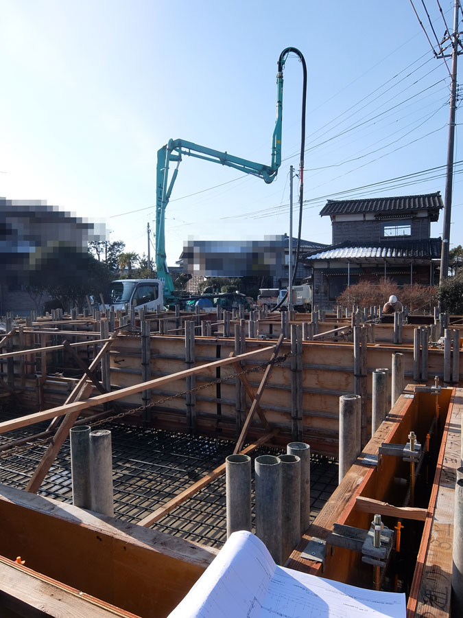 新潟県で2月の晴が3日続くことは記憶にないが、昨日から明日まで天気予報は晴となる。そんな日に基礎のコンクリート打ち込みが行われた。